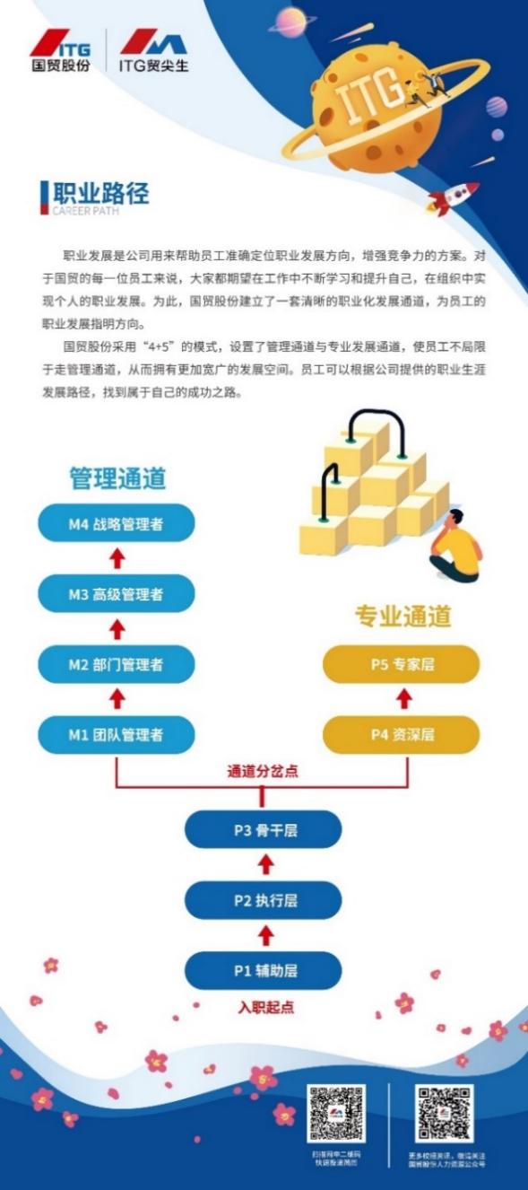 国贸股份采用“4+5”的职业发展双通道模式,设置了管理通道与专业发展通道,使员工拥有更加宽广的职业发展空间。员工可根据个人的职业规划以及专业特长选择寻求相应的发展路径,找到成就自我的成功之路。