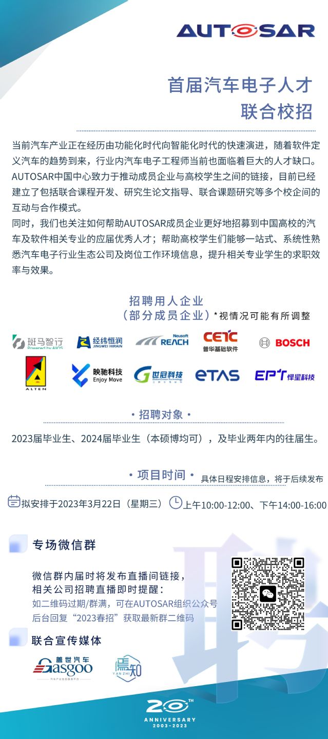 首届AUTOSAR汽车电子人才联合云校招2023届春季校园招聘