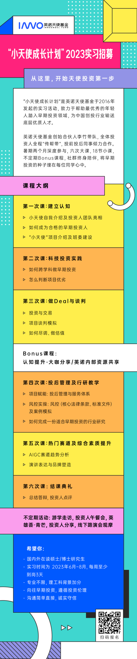 今年,我们将继续招募硕士至博士生阶段的同学,全程由英诺天使基金的一线投资人“传帮带”,6次大课,18节小课,完善的课程体系从0到1入门早期投资,一起探索、拥抱科创新时代。