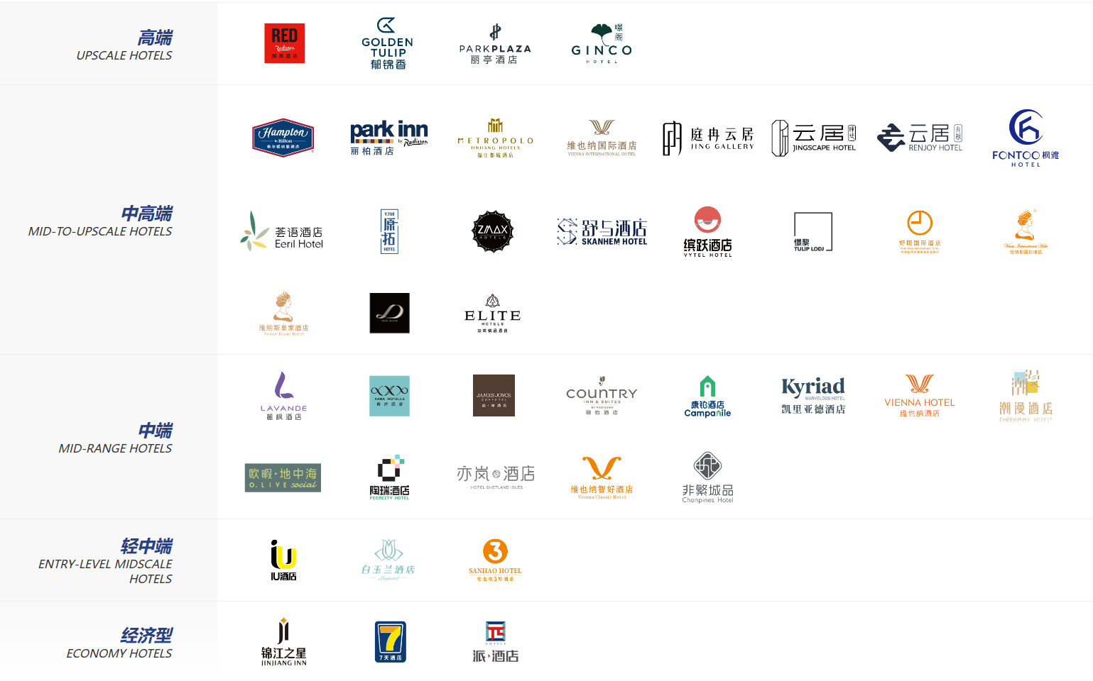 锦江酒店(中国区)目前旗下有锦江都城、维也纳国际、麗枫、希岸、喆啡、凯里亚德、丽怡、锦江之星、希尔顿欢朋、云居、丽芮、郁锦香、暻阁、丽亭、ZMAX、枫渡、憬黎、舒与、缤跃、荟语、陶瑞、丽柏、原拓、维也纳、康铂、欧暇·地中海、潮漫、7天、白玉兰、IU等多元酒店品牌,品牌航母的聚力效应逐步展现。