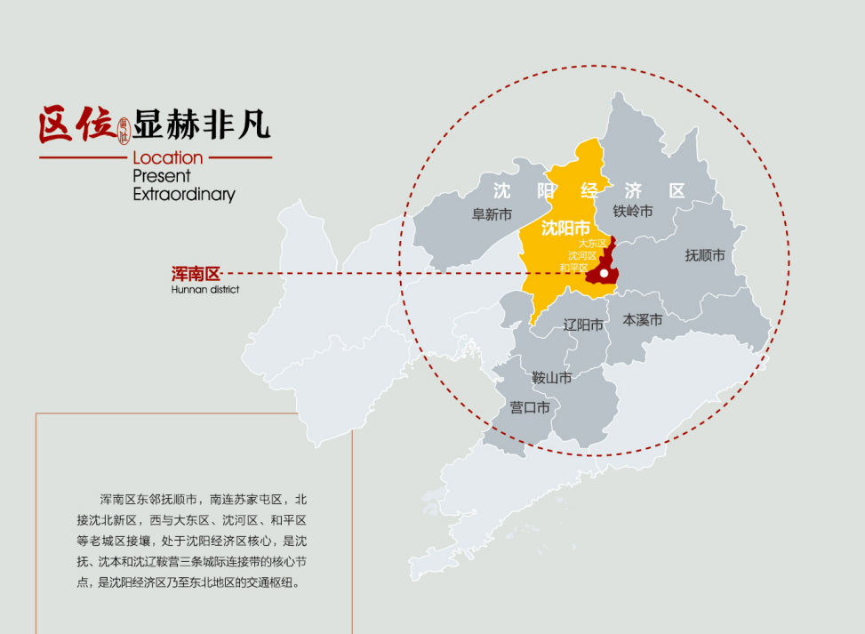 浑南区位独特,是连通八方的枢纽之地。这里战略位置突出,浑南地处东北亚经济圈和环渤海经济圈的中心区域,是沈抚、沈本和沈辽鞍营三条城际连接带的核心节点,是中日、中韩、中俄交流的枢纽关键;这里通达能力强大,坐拥东北地区最大的航空港沈阳桃仙国际机场和高铁客站沈阳南站,民航、高铁、高速、国道、城市轨道交通互通互联,占据沈阳经济区核心位置,是联通沈阳现代化都市圈的交通枢纽。