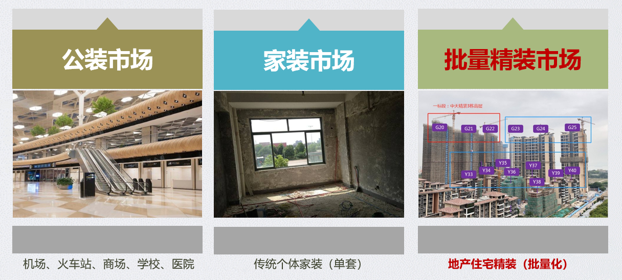 精装修房与毛坯房是相对应的,随着国家节能环保产业政策的实施以及房地产市场的健康发展,批量精装修交楼已是大势所趋,这不仅因为批量精装修顺应了国家低碳环保的产业政策,同时也因为其能提高施工质量、降低造价、节约采购成本和时间成本,既保证了室内的环境质量要求,又能满足广大消费者“轻装修重装饰”的消费理念,有利于实施住宅装修工业化生产,目前在国家政策的推动下,全国已有30多个省份取消住宅毛坯交付,逐步实现全装修交付的产业化目标。因此,住宅批量精装修这一装修行业的细分市场逐步成为城市房地产的新亮点,具有巨大的发展空间。