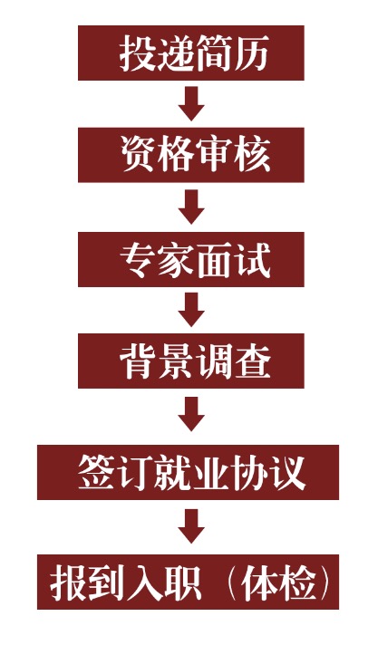 投递简历—资格审核—专家面试—背景调查—签订就业协议—报到入职(体检)