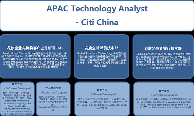 Global Functions Technology 全球职能技术服务部负责为整个花旗银行企业风险管理、资本规划、财务规划和分析、信息安全、合规性指标、审计、评估和控制等职能提供技术开发与支持。