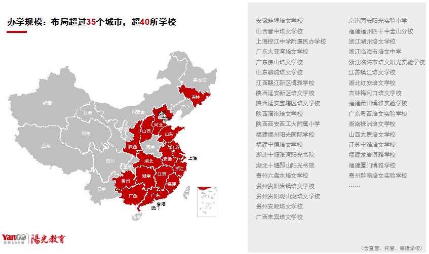阳光控股教育集团作为北大培文教育文化产业(北京)有限公司(北京大学全资公司)的战略合作伙伴,依托北大优质教育资源与阳光控股的雄厚财力,拥有优秀的教育管理团队和丰富的教育投资管理经验,同时积累了加拿大白石学校、美国独立学院、美国亚利桑那州兰乔索兰诺高中等国际一流教育品牌资源,旗下拥有40多所高品质中小学校、200多所幼儿园。