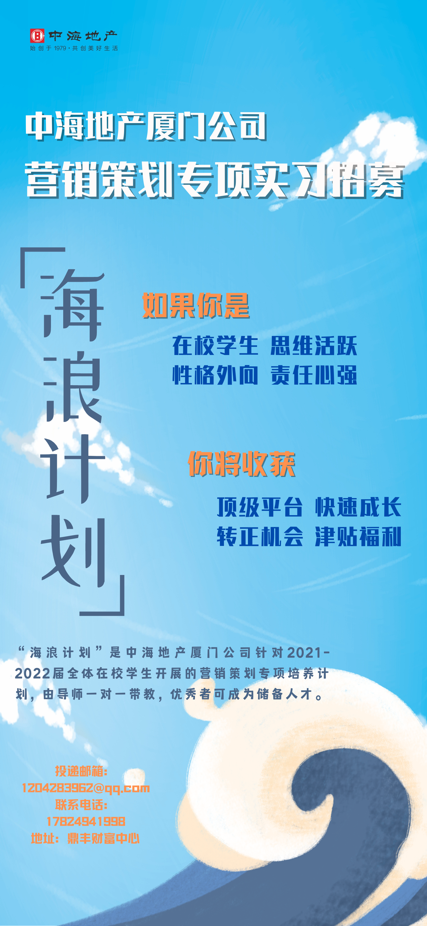 “海浪计划”是中海地产厦门公司针对2021-2022届在校大学生所开展的营销策划专项培养计划,导师一对一带教,在短时期实现营销策划职业能力快速成长,实习期结束后,优秀实习生会有机会成为中海人才储备行列。