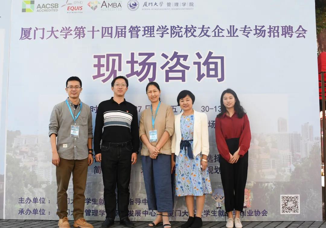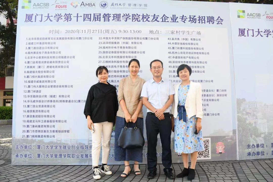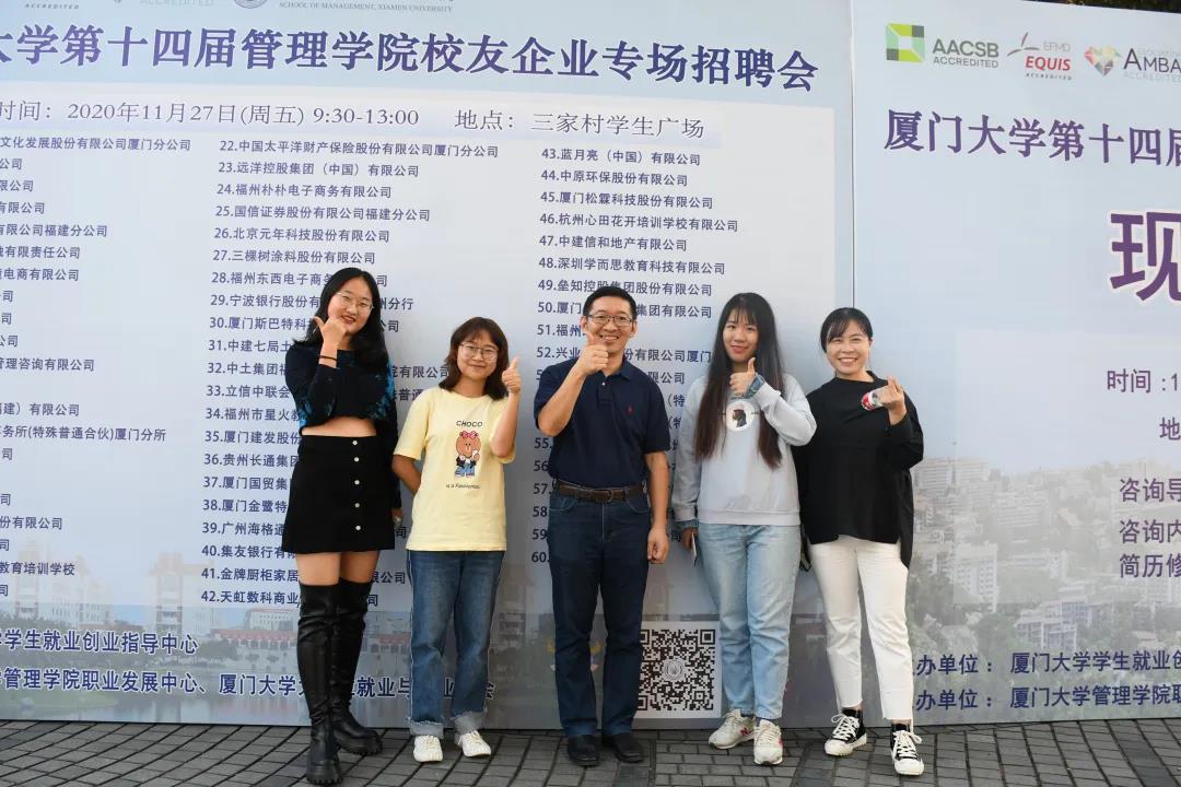 11月27日上午,厦门大学管理学院第十四届校友企业专场招聘会在三家村广场举行。厦门大学学生处副处长高斌;管理学院副院长白云涛教授,管理学院党委副书记戴蓥,管理学院职业发展中心王燊主任、王韦惠;学生处就业科黄静遥出席活动并与各企业招聘人员、应聘学生进行交流。