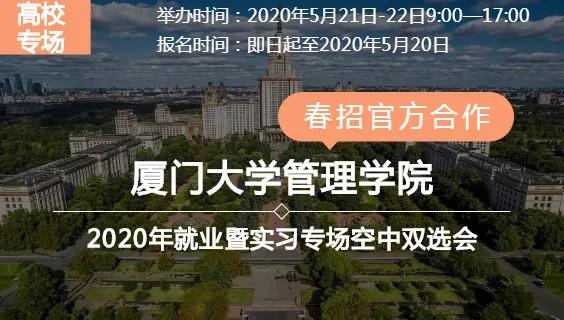 为更好地做好疫情防控期间校园招聘活动,继续为广大在校生和用人单位提供便捷服务,搭建良好交流平台,厦门大学管理学院于2020年5月21日-22日举办了“厦门大学管理学院2020届就业暨实习空中双选会”活动。